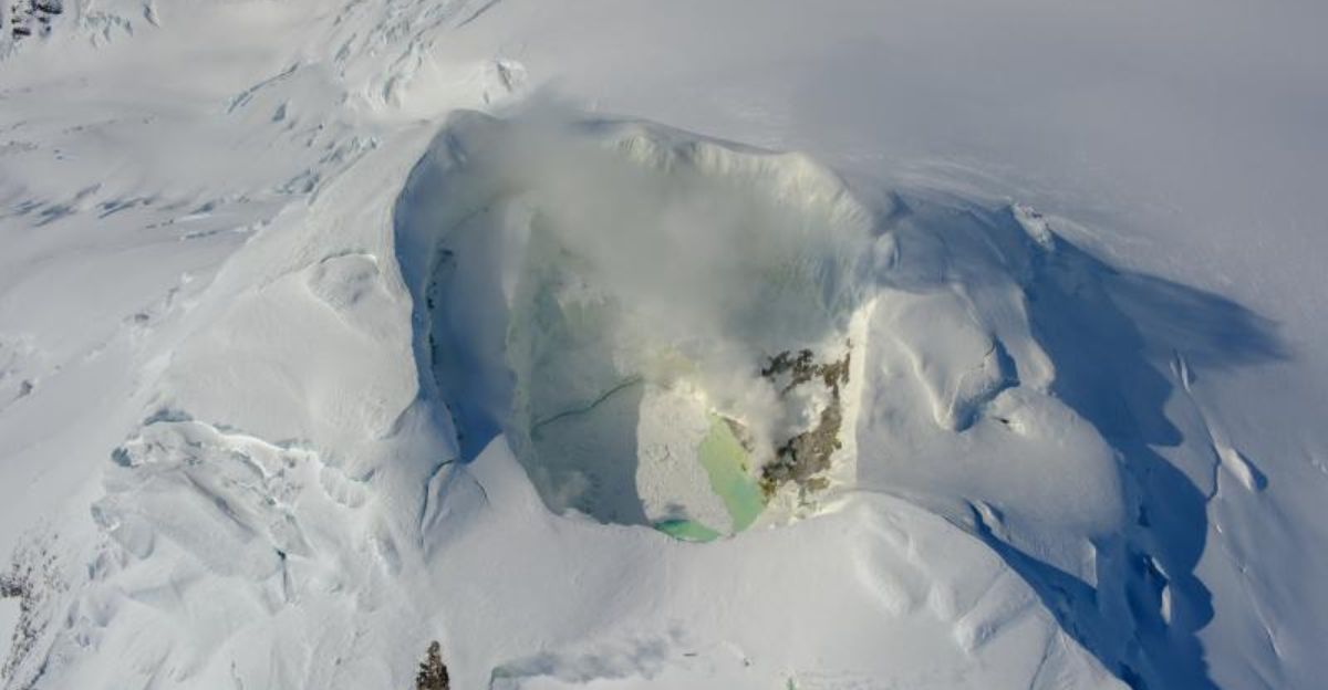 Durante el reciente grupo de actividad volcánica, se formó un nuevo lago caliente en la cima del Mount Spurr, derritiendo hielo y nieve mientras el calor ascendía desde abajo.